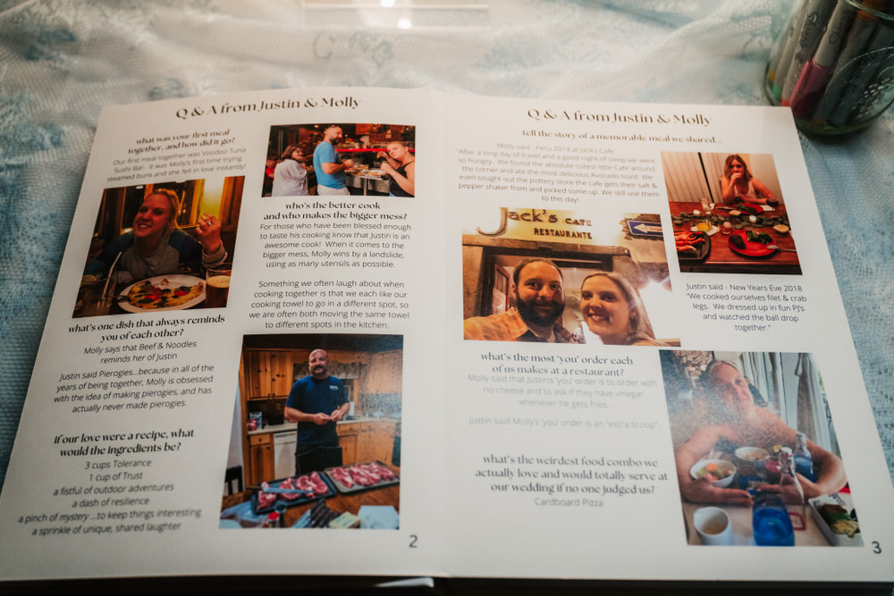 Before the big day, they invited guests to share their favorite family recipes. Those recipes were gathered and turned into a custom, unique wedding cookbook, gifted to every guest. Inside were stories, scribbled notes, and comfort food classics — from Grandma’s brownies to Aunt Sharon’s famous pasta salad. It became more than a keepsake; it was a way of weaving generations together, one recipe at a time.