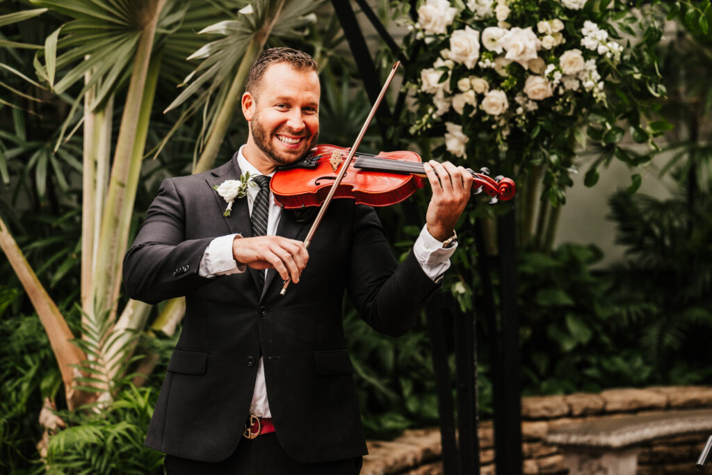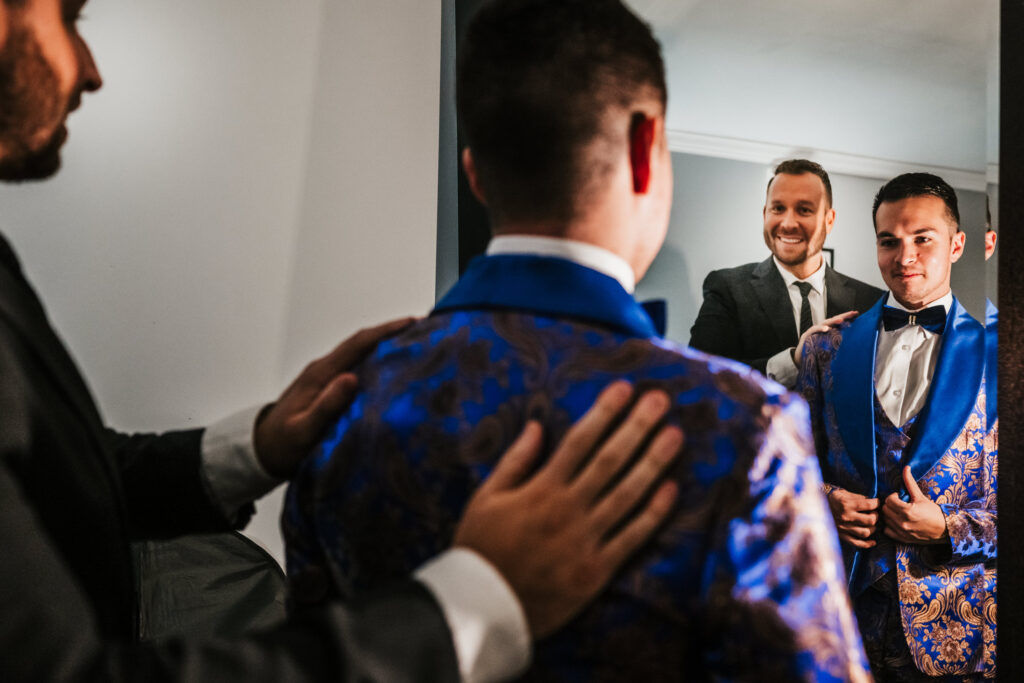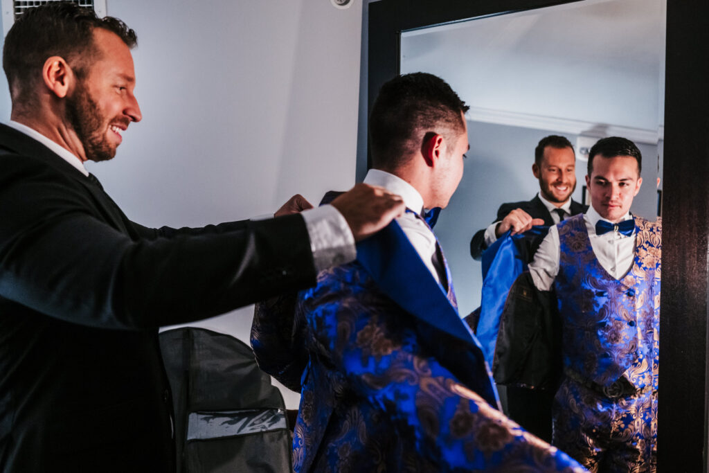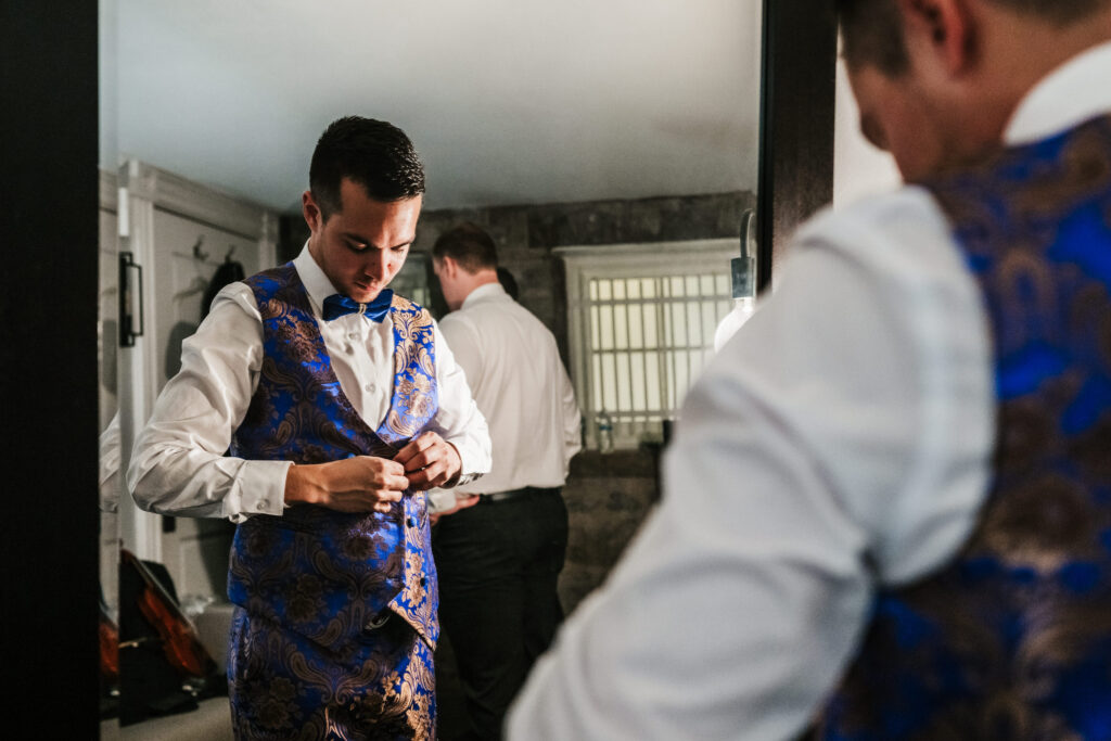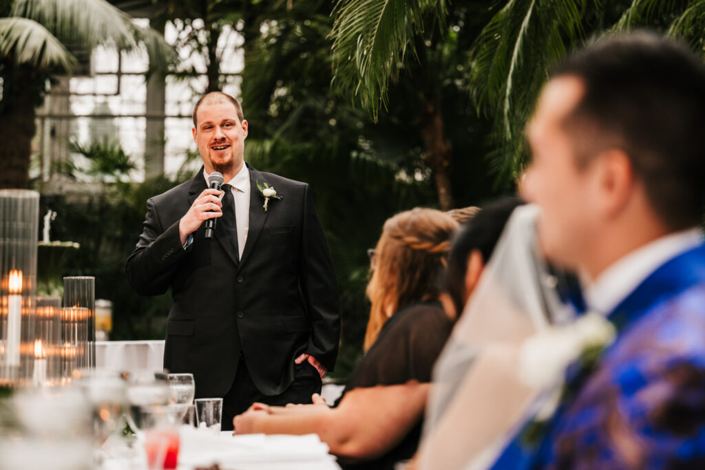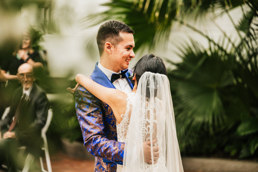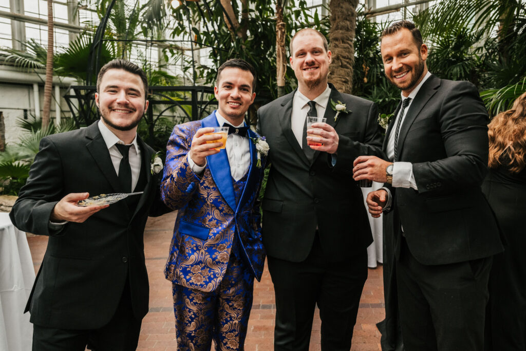 Justin’s look stood out right away. Instead of a traditional tux, he wore a bold blue suit with a lot of personality. The color worked especially well with the neutral tones of the conservatory.