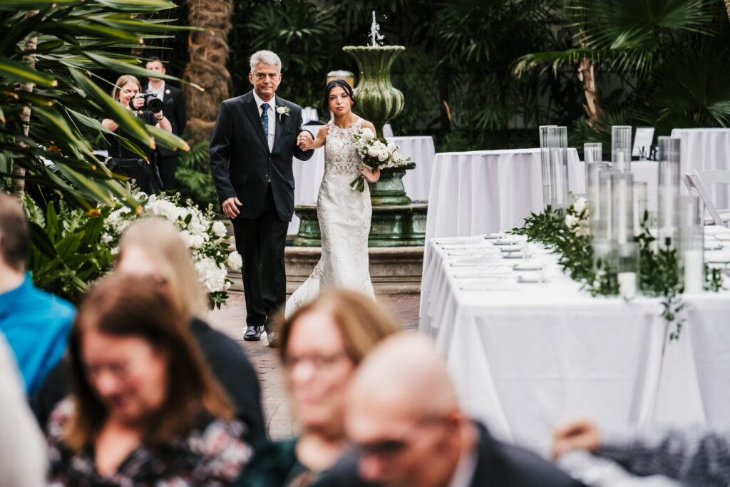 Sydney and Justin exchanged vows surrounded by palms and greenery. Their guests sat beneath the glass ceiling while sunlight filled the room. Because the space already feels warm and inviting, very little décor was needed.
